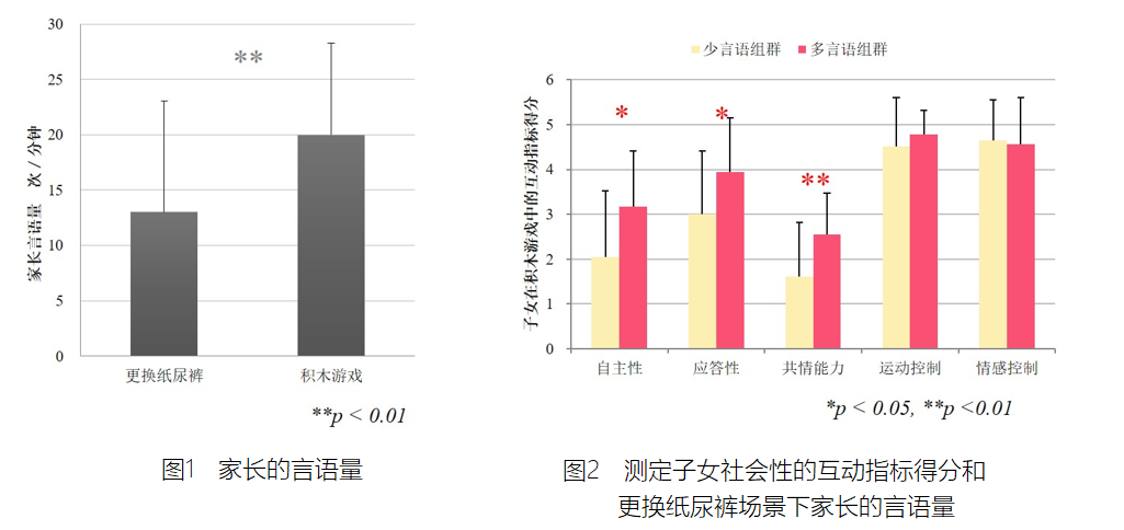 通过对更换纸尿裤和积木游戏两种情境中分别计数得知的家长的言语量进行比较来看,更换纸尿裤时的言语量较少(图1)。从这一结果也可以推测出,与游戏时间有所不同,家长对更换纸尿裤时亲子互动的重要性还认识不足。