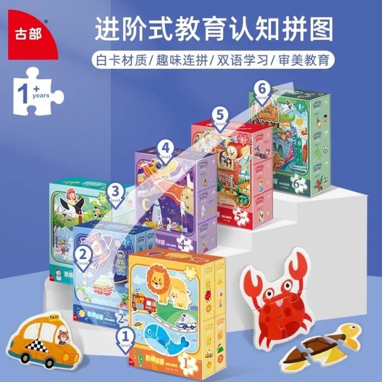 古部的“进阶式教育认知拼图”,则根据儿童年龄精准划分为6个阶段,1-6岁都可玩,采用多款不同主题,由易至难逐渐进阶,每盒拼图都附赠家长手册、成长记录卡、贴纸,拼片双面印刷,儿童可以边玩边学。