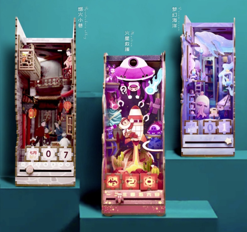 鲸空玩具 “DIY拼装书立”,采用木质材质,可拼搭烟火小巷、火星救援、梦幻海洋等微缩主题场景,成品造型不仅可作为书立使用,还增加了日历功能。微缩场景造型还设有发光装置,不仅增强了成品的美观度,还可作为夜灯使用,增强了实用性。
