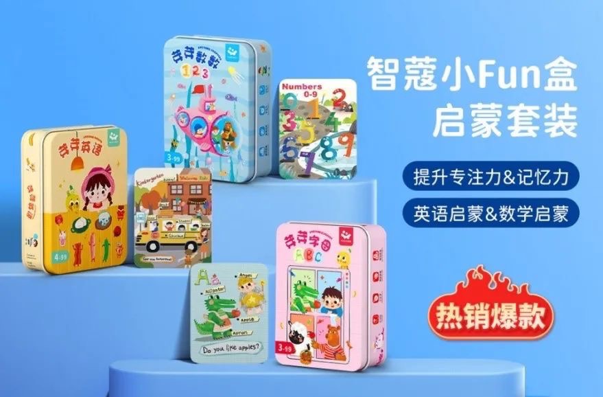 智蔻玩具旗下的“智蔻小Fun盒启蒙套装”,是一套简单有趣的知识启蒙益智游戏,包含芽芽数数、芽芽字母、芽芽英语三个单品,在兼具知识性与趣味性的游戏中,科学提升孩子的专注力、记忆力和观察力。 游戏卡片由美国插画师手绘设计,根据孩子擅长图像记忆的特点,通过儿童插画帮助孩子进行英语启蒙及数学启蒙,在趣味互动玩法中激发孩子大脑活力。另外,该产品还配有英语点读功能,帮助孩子轻松掌握高频单词和日常用语。
