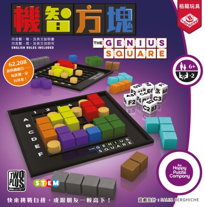 栢龙玩具的桌游产品“机智方块”,由7颗骰子、游戏版图、不同形状的彩色积木、柱子棋子组成,掷出7颗骰子,按骰子上的结果,在游戏版图相应坐标的位置放置柱子棋子,最快用全部9块积木填满空格的玩家获胜。在游戏过程中锻炼儿童空间思维能力和视觉认知能力。
