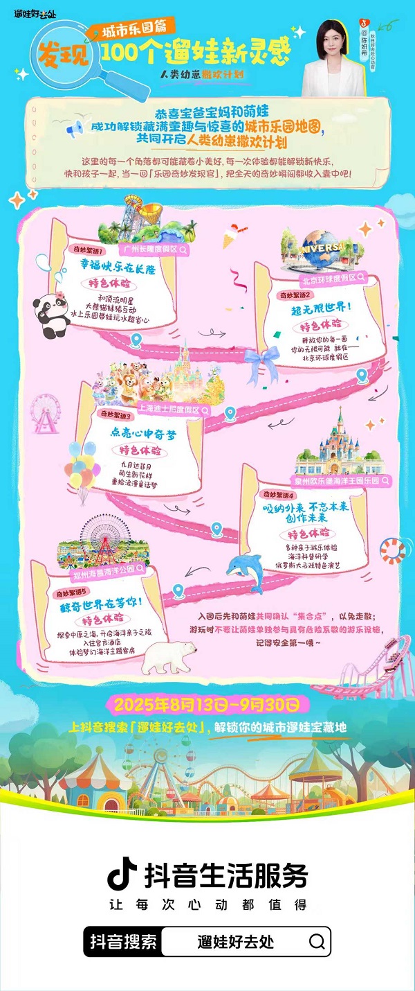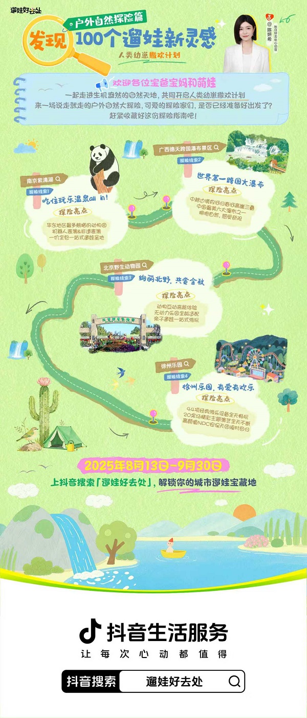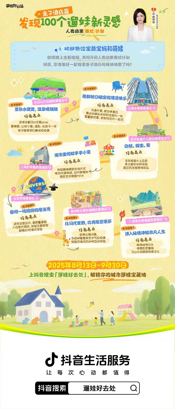 抖音生活服务「遛娃好去处」活动以亲子酒店、户外探索、城市乐园、文化研学四大场景为核心,已为大家编织了一张“遛娃宝藏地图”,四大场景满足千万家庭出游需求,解锁100个遛娃新灵感!