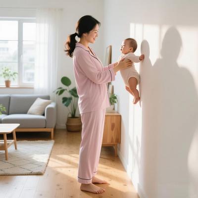 把宝宝调整为天然负重工具,后脑勺轻贴墙面时,能感受到颈椎正在归位。这个动作的精妙在于:宝宝重量会自然将母亲肩胛骨向后向下牵引,比任何健身器械都更懂人体工学。当婴儿的脸颊贴着胸口,母亲的呼吸会自动变得绵长——这既是体态矫正,也是母婴间的生物节律同步。