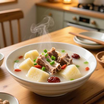 食材准备 :瘦肉100克、山药150克、红枣5颗、生姜2片。将瘦肉切块焯水去腥,山药去皮切滚刀块,红枣去核备用。所有食材入锅加清水,大火煮沸后转小火慢炖20分钟,最后以少许盐调味即可。