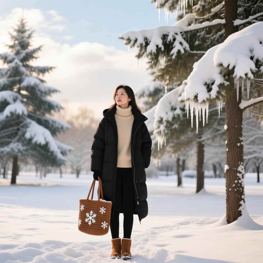 选择过膝设计的深色羽绒服,内搭高领打底衫形成纵向延伸感。搭配技巧在于“外松内紧”——羽绒服下穿九分紧身裤,露出纤细脚踝,配短靴拉长比例。若想增添层次感,可在腰间系一条细腰带,避免整体膨胀。