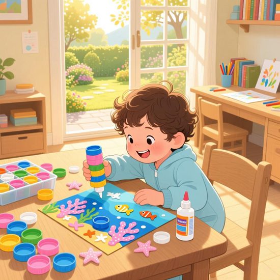 当创意遇上执行,魔法就开始了。蓝色瓶盖变身灵动的小鱼,粉色瓶盖绽放为娇艳的花朵,白色瓶盖则化作天空中的云朵。粘贴完成后,用马克笔添加鱼鳍、花茎等细节,一幅独特的拼贴画便跃然纸上。这种创作过程不仅锻炼孩子的手眼协调能力,更让他们在实践中理解色彩搭配与形状组合的美学原理。