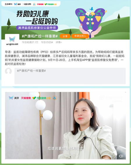 话题来源于由澜渟健康、天猫健康、阿里健康、江苏省妇儿基金会公益四方联合发起的线上公益活动“我助妇儿康,一起挺妈妈”。两天时间里,喵大仙带你停药带你菲V、幸福妮洁V、妇产科医师郭晓静V等十余个微博大V都参与了该话题的讨论,在科普盆底肌松弛的形成原因的同时,也给产后妈妈分享了盆底肌修复的各种建议。正如发起方之一澜渟健康官微号召的:“在孩子出生前,每位妈妈都重视产检,产检关乎一个胎儿的一生,是对胎儿责任的起点;而在孩子出生后,也请重视起妈妈的产康吧,因为产康关乎一个妈妈的一生,是对妈妈关爱的起点”