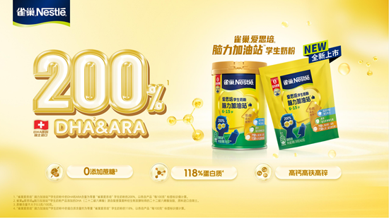 基于前沿的观念和研究成果,雀巢学生营养依托全球的科研资源和本土洞察,推出了新品雀巢®爱思培® 脑力加油站™学生奶粉。该新品日前也亮相亚洲营养大会雀巢展区,以双倍DHA和ARA脑营养组合、高倍营养素以及零蔗糖添加设计,为学生营养赛道带来首款主打大脑发育的全新功能性产品。