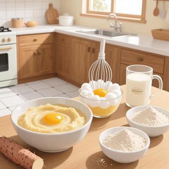 混合食材 :将山药泥、牛奶与蛋液拌匀,筛入面粉翻拌至无颗粒。
