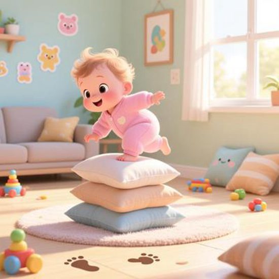 将枕头间隔排列成“山路”,牵着宝宝的手示范跨步动作,初期可缩短间距。成功后贴上贴纸鼓励:“宝宝跨过小山啦!”逐步增加难度,锻炼腿部力量与平衡感。