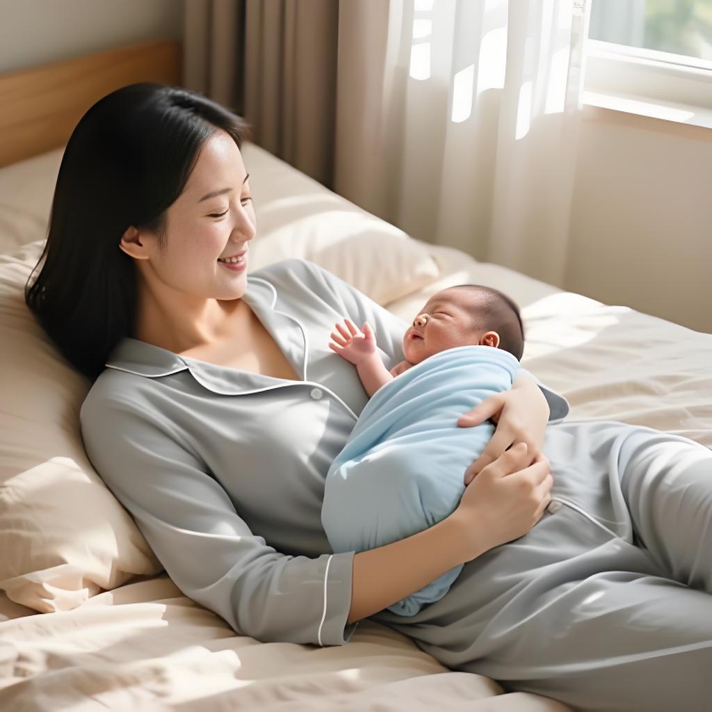 像两片交叠的羽毛,妈妈侧卧时,让宝宝与自己保持平行。下方手臂化作摇篮,托住稚嫩的头颈与腰臀;上方手臂轻覆背部,如同守护的羽翼。腹部悬空,伤口得以呼吸,而宝宝的每一次心跳都能透过床单传来。这种姿势尤其适合夜间哺乳,黑暗中将呼吸声当作彼此的坐标。