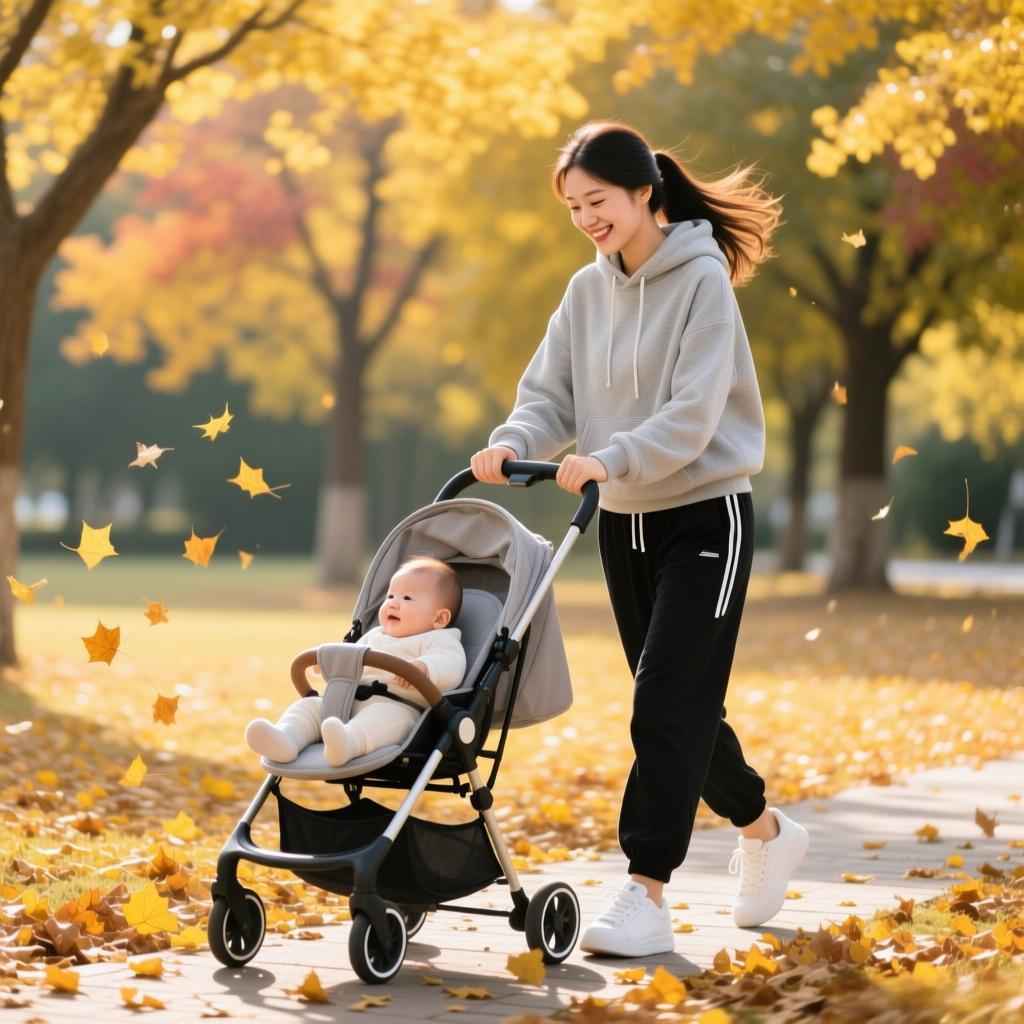 当第一缕秋风拂过面颊,休闲运动风便成了最实用的选择。浅灰色连帽卫衣的宽松版型像一位体贴的朋友,温柔地遮掩着产后尚未完全恢复的身形;黑色高腰运动裤则如同一位严格的教练,不动声色地提升腰线,收紧腹部。白色运动鞋轻快地踏过落叶,陪伴妈妈们走过无数个遛娃的清晨与黄昏。这套装扮的精妙之处在于,它既满足了随时需要弯腰抱娃的功能需求,又在不经意间完成了视觉显瘦的魔法。