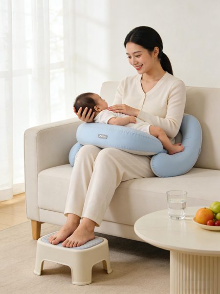 坐姿哺乳 :别再做"驼背族"!在腰部放记忆棉靠垫,脚下垫10-15cm高的小凳子,把宝宝放在哺乳枕上,让TA的嘴与你的乳头自然对齐。