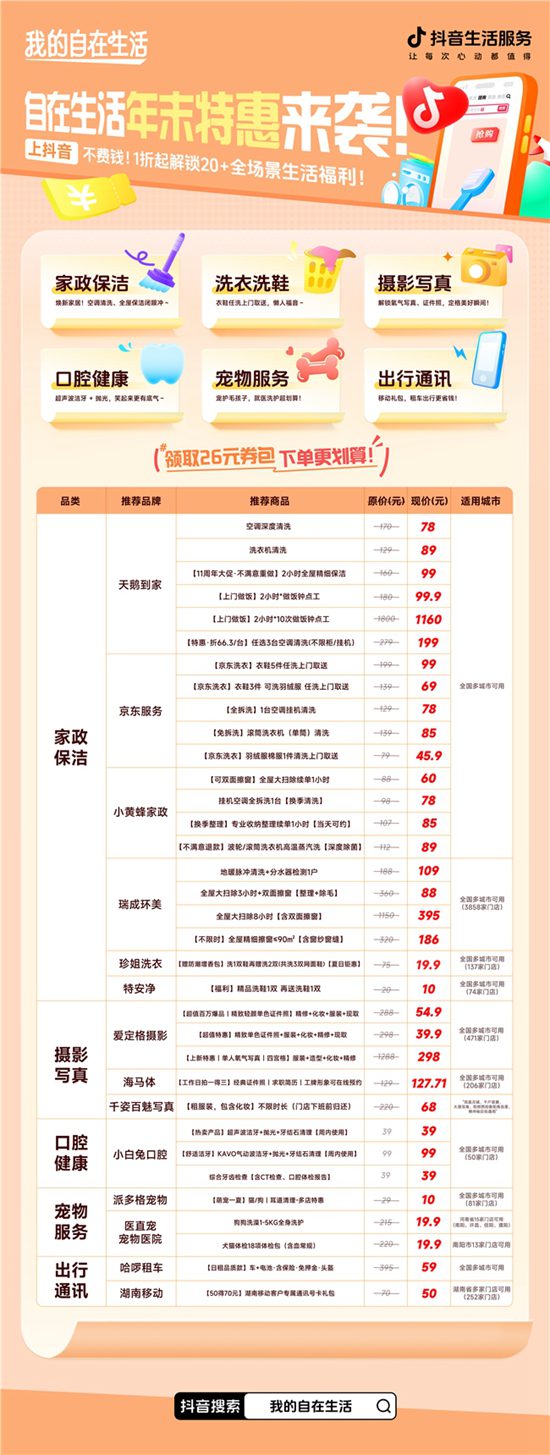 3.体系化内容引导,搭建高效决策支撑: 活动期间,平台通过构建“深度攻略+聚合清单”的内容矩阵,系统性引导用户决策。一方面,通过《年终健康干货盘点》《年末家务速通攻略》等内容,以专业视角帮助用户厘清复杂需求,提供清晰的选购参考;另一方面,推出《自在生活年末特惠》主题清单,以“上抖音,不费钱!1折起解锁20+全场景生活福利”为明确指引,直观呈现家政保洁、洗衣洗鞋、摄影写真、口腔健康、宠物服务、出行通讯等跨品类优质供给。凭借平台公信力与信息整合力,有效降低了用户的选择成本与信任门槛。