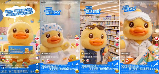 同时,抖音生活服务与经典高热IP B.DUCK小黄鸭联动,当小黄鸭成为「周五遛娃大使」,直接萌化你的心,来「遛娃好去处」,既能和小黄鸭一起享受买买买的亲子快乐时光,也能体验到亲子洗浴的治愈温暖,更有小黄鸭陪你在温馨酒店安稳入睡。